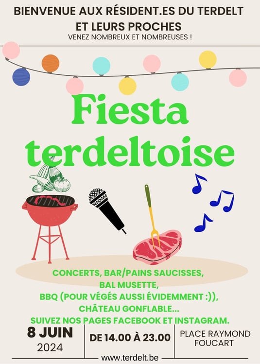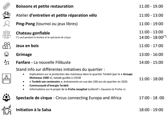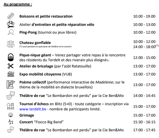 Cette année, pas de brocante, mais le Comité de Quartier Terdelt vous a concocté un programme festif qui devrait ravir petits et grands ! Concerts, initiation à la salsa, château gonflable, tournoi d’échecs, atelier de réparation de vélo, grimage, bar et grand barbecue seront notamment de la partie ! Nous aurons également le plaisir d’accueillir un stand de Blablabar et l’asbl « Agissons ensemble », qui vendra de la nourriture faite par leurs membres et bénéficiaires.